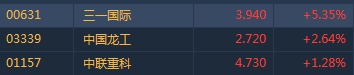 智通财经APP获悉,重型机械股集体反弹,三一国际(00631)领涨板块。截至15时15分,三一国际涨5.35%,报价43.94港元,中国龙工(03339)涨2.64%,中联重科(01157)涨1.28%。