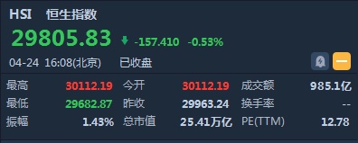 智通财经APP获悉,恒指早盘高开148.95点或0.5%,报30112.19点。截至收盘,恒生指数跌157.41点或0.53%,报29805.83点,全日成交额达985.17亿。国企指数跌0.57%,报11663.78点,红筹指数涨0.1%,报4645.46点。