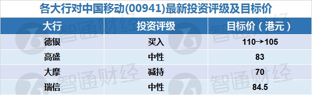 一、各大行对中国移动(00941)最新投资评级及目标价