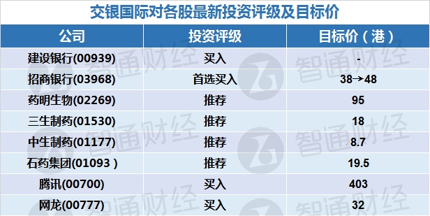 二、交银国际对各股最新投资评级及目标价
