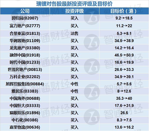 三、瑞银对各股最新投资评级及目标价
