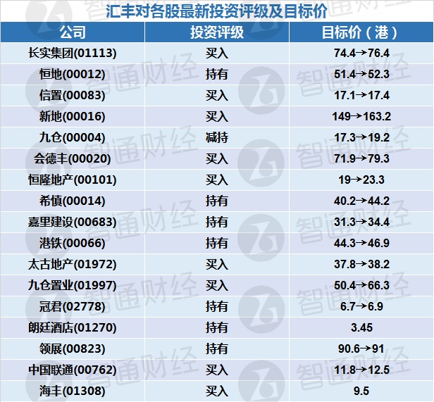 四、汇丰对各股最新投资评级及目标价