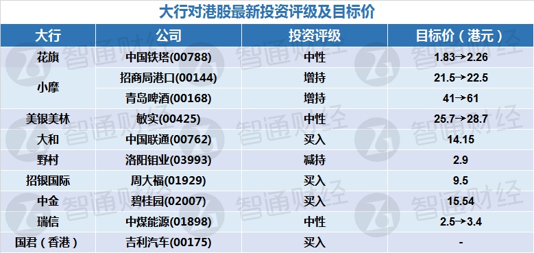 五、大行对港股最新投资评级及目标价