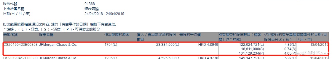 智通财经APP获悉,根据联交所资料显示,摩根大通于4月18日减持特步国际(01368)2338万股,每股作价4.89港元,总值约1.14亿港元,最新持股数目1.22亿股,最新持股比例为4.89%。