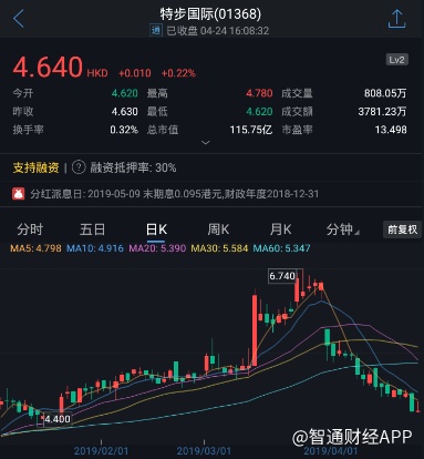 截至今日收盘,特步国际(01368)收涨0.22%,报4.64港元。