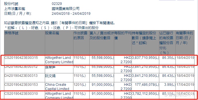 智通财经APP获悉,根据联交所资料显示,Alltogether Land Company Ltd于4月16日及18日合共增持国瑞置业(02329)约1.46亿股,每股作价2.72港元,总值约4亿港元,最新持股数目38.37亿股,最新持股比例为86.35%。