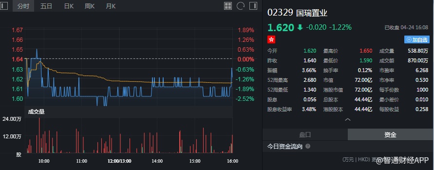 截至今日收盘,国瑞置业(02329)收跌1.22%,报1.62港元。