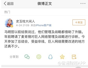 史玉柱微博称,“马明哲以前给我说过,他们管理及战略都借助了外脑。年前聘请了麦肯锡对巨人网络管理及战略进行诊断。今天参加了总结会,受益非线(匪浅),巨人网络需要改进的地方还真不少。”