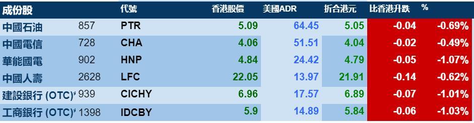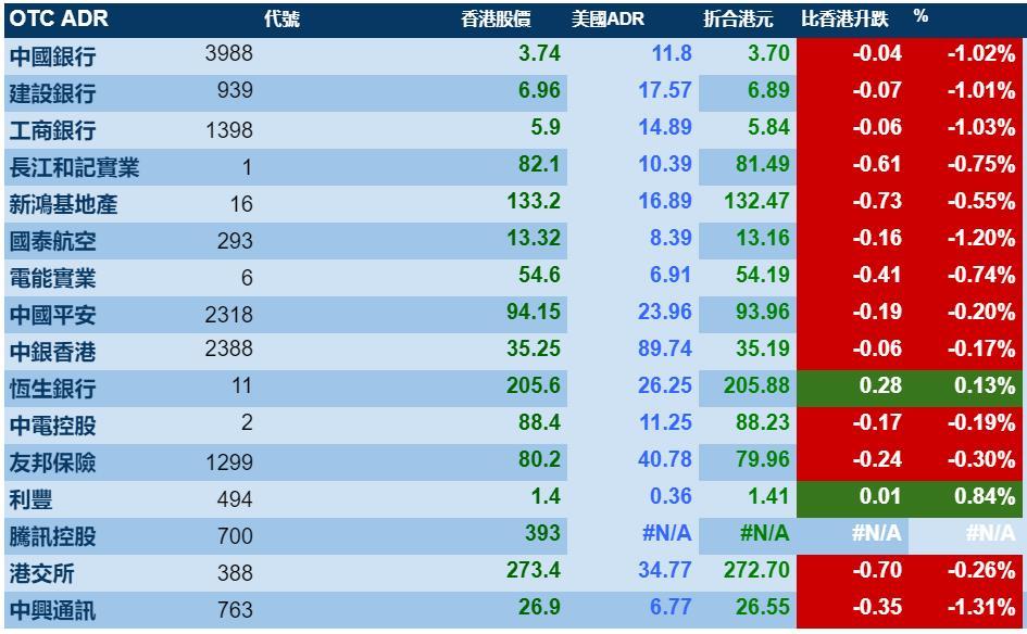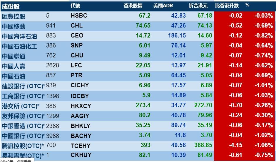 智通财经APP获悉,周四美股出现0.22%幅度下跌,港股ADR指数也未能走出独立行情,按比例计算,收报29626点,跌178.80点。大型蓝筹几乎全线下跌,汇丰控股收报67.18元,较港收市跌0.02元。