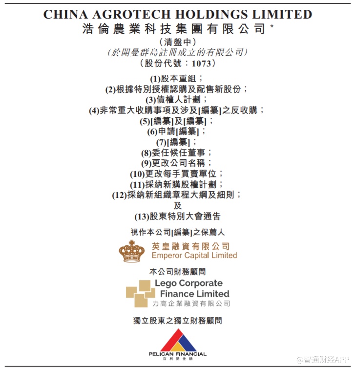 浩伦农科的股份已自2014年9月18日下午1时正起暂停于联交所买卖,以待刊发有关该公司于江西附属公司营运及可能资产减值以及其债务状况的内幕消息。该公司无意于复牌后继续现有业务。于收购事项完成后,禹铭将成为该公司的全资附属公司及经扩大集团将主要从事提供企业融资顾问服务及资产管理服务。