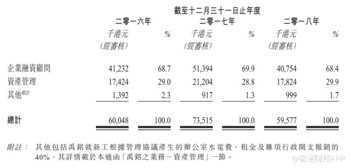 禹铭为提供企业顾问服务及资产管理服务的金融服务供应商。截至2018年12月31日止三个年度各年,禹铭企业融资顾问服务产生之收益分别约为4120万港元、5140万港元及4080万港元,分别占禹铭总收益约68.7%、69.9%及68.4%。