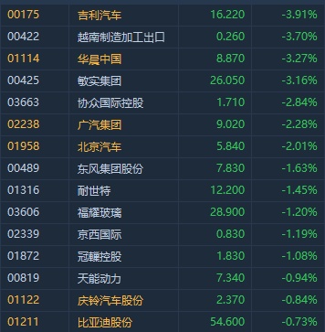 智通财经APP获悉,汽车板块早盘延续弱势,悉数走低,截至发稿,吉利汽车(00175)跌3.91%,华晨中国(01114)跌3.27%,敏实集团(00425)跌3.16%,北京汽车(01958)跌2.01%。