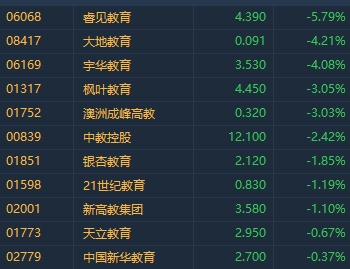 此外,睿见教育(06068)昨日发布中期业绩,收入同比增长41.1至8.36亿元人民币,毛利同比增长44.7%至3.787亿元,今日股价也大幅下挫。