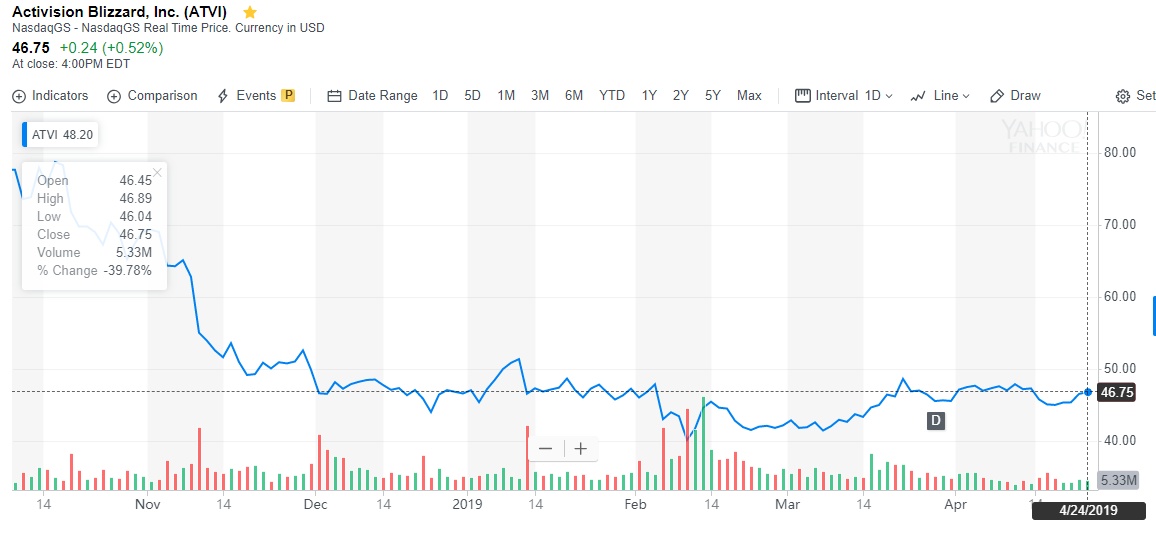 智通财经APP获悉,美东时间4月24日,动视暴雪(ATVI.US)收盘上涨0.52%,股价达46.75美元。