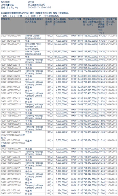 与此同时,大股东持续加仓的行为也耐人寻味。根据披露易官网披露,天工国际自2018年6月开始,大股东们有持续买进股票的动作,直到2018年底都未出现一笔卖出的交易,10月25、26日两日更是被香港女股神刘央和Riverwood Asset Management (Cayman) Ltd连续扫货1.38亿股和1.27亿股。