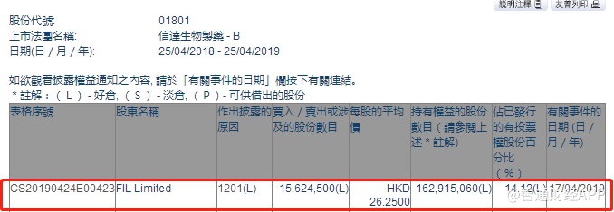 智通财经APP获悉,根据联交所资料显示,富达于4月17日减持信达生物(01801)1562万股,每股作价26.25港元,总值约4.1亿港元,最新持股数目约1.62亿股,最新持股比例为14.12%。