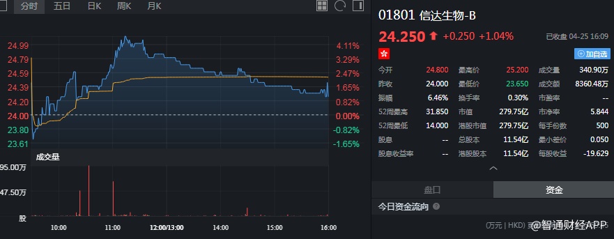 截至今日收盘,信达生物(01801)收涨1.04%,报24.25港元。