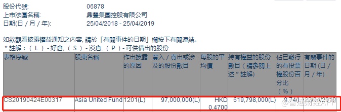 智通财经APP获悉,根据联交所资料显示,Asia United Fund于4月23日减持鼎丰集团(06878)9700万股,每股作价0.47港元,总值约4559万港元,最新持股数目约6.19亿股,最新持股比例为9.74%。