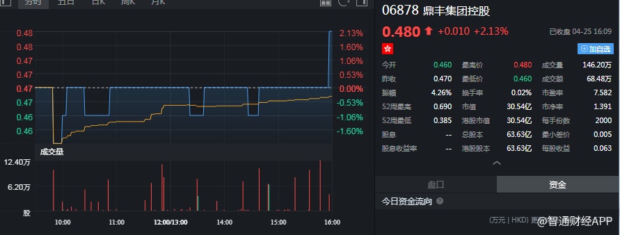 截至今日收盘,鼎丰集团(06878)收涨2.13%,报0.48港元。