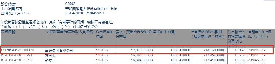 智通财经APP获悉,根据联交所资料显示,华能国际电力(00902)于4月24日获重阳集团增持1204万股,每股作价4.80港元,总值5779万港元,最新持股数目约7.14亿股,持股比例增至15.19%。