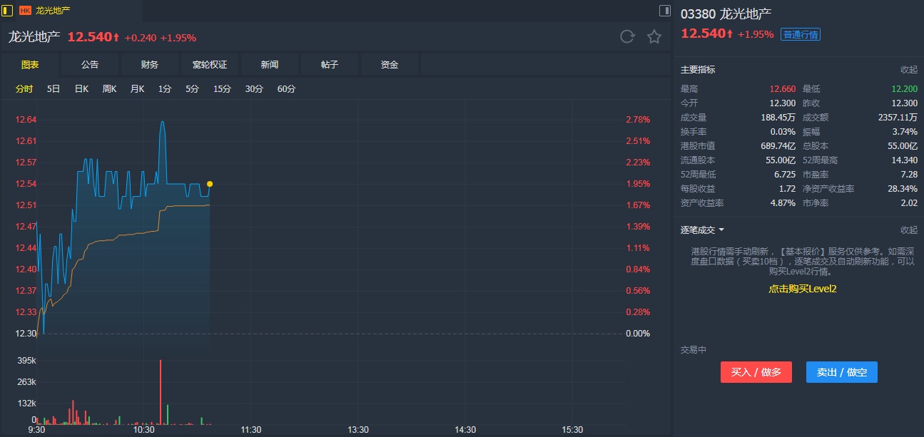 瑞银此前报告指出,龙光地产2018年核心盈利为76.6亿元,盈利增长强劲,核心利润率为17.3%,盈利能力继续领先行业,派息率为51%,股息优厚。2019年可完成850亿元的权益合约销售目标,业绩可望持续有质量增长。此外,龙光是大湾区产业结构升级和高净值人口持续流入的主要受益者,聚焦大湾区主要城市的刚性住房需求,土地成本低廉,具有跨周期盈利增长能力,融资渠道多元化,融资成本及净负债率可控,执行力强,具有长期投资价值。