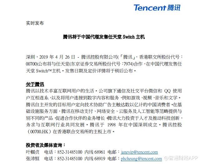 智通财经APP获悉,4 月 26 日,腾讯控股(00700)公布将与任天堂合作,在中国代理发售任天堂 Switch™主机,发售日期及定价详情将于稍后公布。