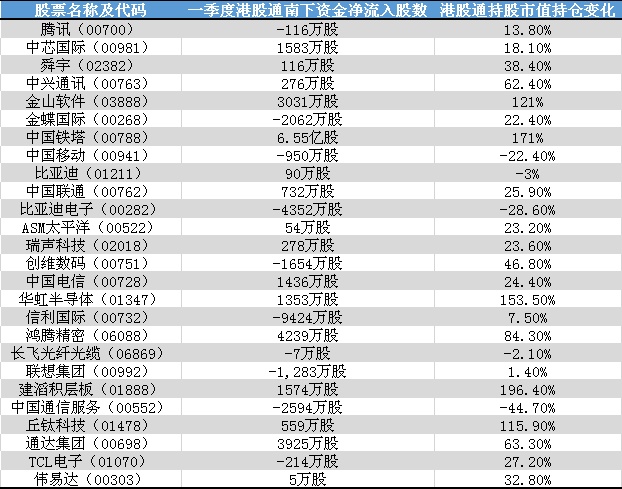 中金发表报告指,公募基金今年首季报告基本披露完毕,该行分析了基金电子、通信板块的持仓情况及变化趋势,今年首季“港股通”南下资金主要增持中国铁塔(00788) 、鸿腾精密(06088) 、通达集团(00698)等,主要减持信利国际(00732) 、中国通信服务(00552)等,对通信设备、晶圆代工及消费电子领域的优质个股配置意愿较高。