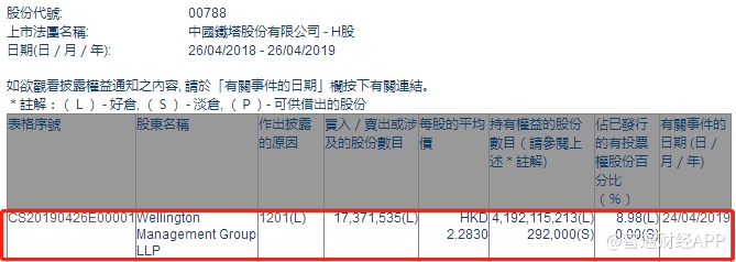 智通财经APP获悉,根据联交所资料显示,威灵顿资产管理于4月24日减持中国铁塔(00788)1737万股,每股作价2.28港元,总值约3960万港元,最新持股数目约41.92亿股,最新持股比例为8.98%。