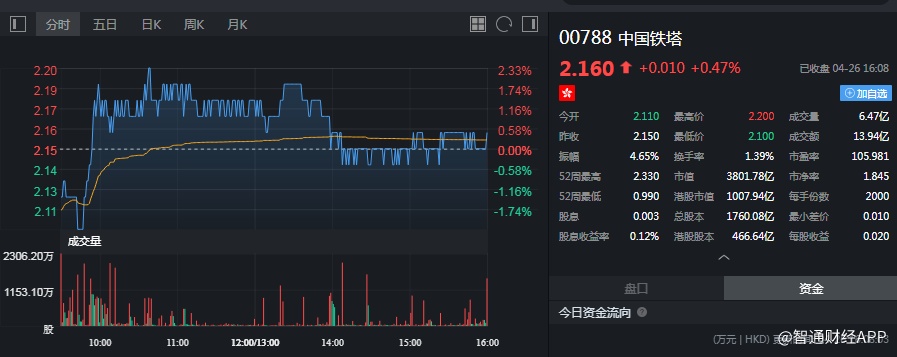 截至今日收盘,中国铁塔(00788)收涨0.47%,报2.16港元。