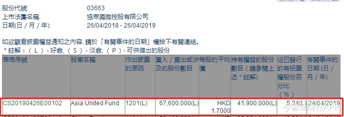 智通财经APP获悉,根据联交所资料显示,Asia United Fund于4月24日减持协众国际(03663)6760万股,每股作价1.7港元,总值约1.15亿港元,最新持股数目4190万股,最新持股比例为5.24%。