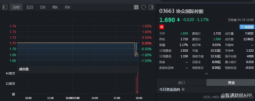 截至今日收盘,协众国际(03663)收跌1.17%,报1.69港元。