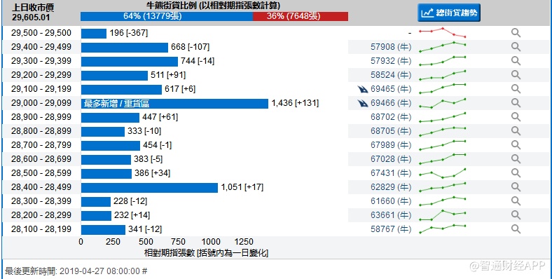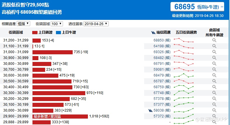 智通财经APP获悉,截至4月26日,恒指最新的牛熊街货比例64:36。从瑞信恒指牛熊证街货分布图中得到的数据显示,熊证街货重货区在29900-29999区间,该区间最新熊证数量为1018张,较上一交易日增加592张;最多新增区间也在该区间。牛证街货重货区在29000-29099区间,该区间最新牛证数量为1436张,比上一交易日增加131张;最多新增区间在同一区间。