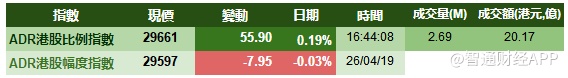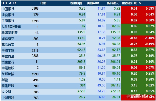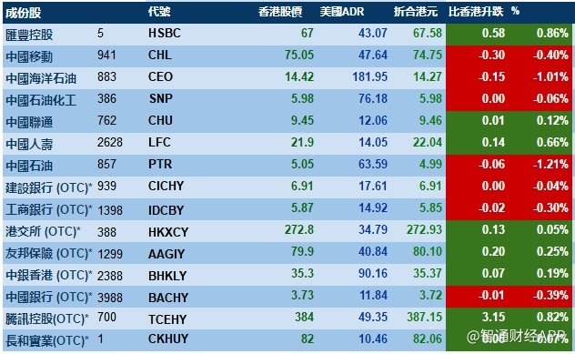 智通财经APP获悉,美股走强,刺激港股ADR指数走高,按比例计算,收报29661点,升55.9点。大型蓝筹全线走强,汇丰控股收报67.58元,较港收市升0.58元;腾讯控股收报387.15元,较港收市升3.15元。油股急挫,中石油收报4.99元,较港收市跌0.06元;中海油收报14.27元,较港收市跌0.15元。