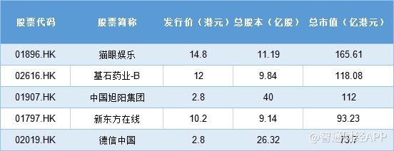 据智通财经APP统计,按上市时的总股本计算,一季度的新股整体体量较小,普遍总市值在50亿港元以下,仅三只新股总市值超过百亿,分别为猫眼娱乐、基石药业-B、中国旭阳集团。其中,猫眼娱乐以165.61亿港元的总市值,成为一季度的最重磅股。