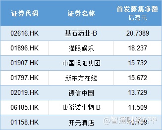 据智通财经APP统计,36只新股中,仅基石药业-B、猫眼娱乐、中国旭阳集团、新东方在线、德信中国、康希诺生物-B、开元酒店等7只新股募资净额超过10亿港元,其中基石药业-B募资总额最高,达20.74港元。