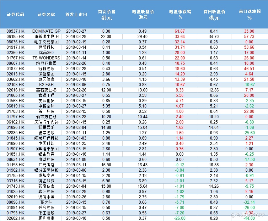 据智通财经APP统计,23只在暗盘获得上涨的新股,有20只在上市首日出现上涨,相关度达87%。其中,在暗盘涨超30%的4只新股,在上市首日平均涨幅达36.60%。在暗盘获得33.64%涨幅的康希诺生物-B,在上市首日以57.73%的涨幅成为一季度首日市场表现最佳新股。