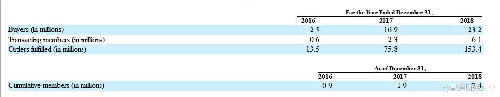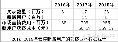 而通过新用户获客成本数据看,结果便一目了然。2017年时,市场营销费用7.08亿,新增用户1400万,新用户的获客成本为50.57元。但至2018年时,营销费用上升至9.55亿元,新增买家却仅有600万,获客成本翻三倍至159.17元每位。