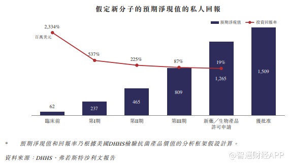 在十年左右的药物研发周期中,不同阶段的成本和回报率不同。据美国卫生与公众服务部一项分析研究表明,一个假定新分子的预期净现值及投资回报率取决于药物研发各个阶段的失败率,药物开发早期阶段的投资回报率通常高于后期阶段。