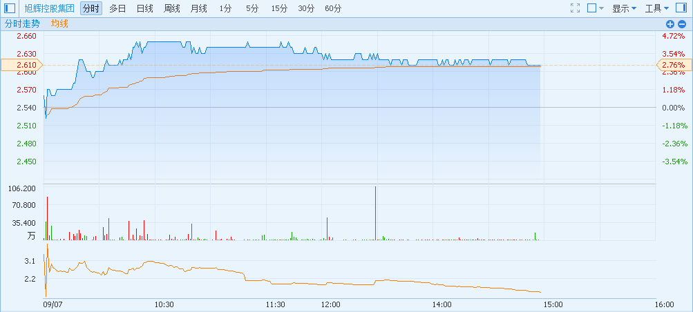 旭辉控股集团(00884)宣布8月合同销售增54%,因此股价造好,盘中一度涨4.33%,高见2.65港元,创上市新高,截至14时59分,涨2.76%,报价2.61港元,成交1181.74万股,成交额3081.57万港元。