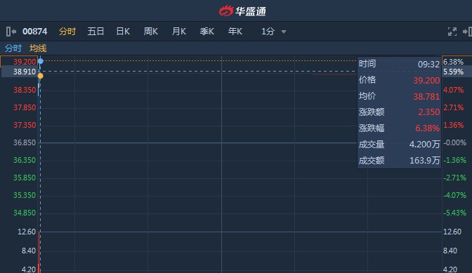 智通财经APP获悉,白云山(00874)昨日晚间发布首季度业绩,股东应占净利同比增55.42%至14.07亿元人民币,此消息刺激股价大幅上扬,AH股同步上涨。截至9时31分,涨6.24%,报价39.15港元,成交额871万。