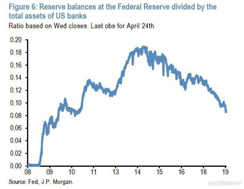 Panigirtzoglou表示,将目前的名义准备金水平与美国银行体系规模进行比较时,准备金空间的紧缩也很明显。如下图所示,该图描绘了美联储的准备金余额除以美国银行的总资产。最近,这一比率自2011年初以来首次降至9%以下,接近与2009年底时的水平。这显示出,美国银行体系的流动性状况已接近十年来最为紧张的水平。