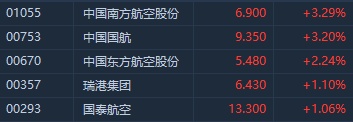 智通财经APP获悉,航空股早盘小幅反弹,截至发稿,南航(01055)涨3.29%,国航(00753)涨3.2%,东航(00670)涨2.24%。