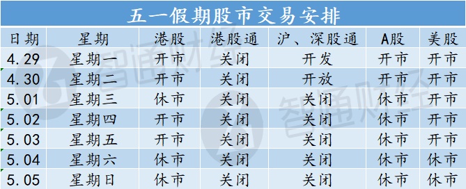 智通财经APP获悉,五一假期来临,港股本周三(5.01)休市一天,A股周三至周日均休市(5.01-5.05),美股正常开市。