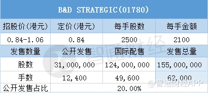 智通财经APP获悉,4月29日,B&D STRATEGIC(01780)配售结束。配售招股价区间为0.84-1.06港元,最终定价0.84港元,每手2100港元。
