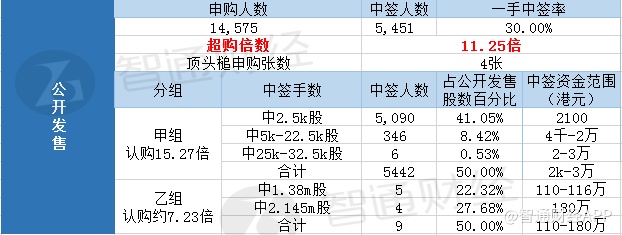 其中,公开配售申购人数14575人,一手中签率30%,超购倍数11.25倍。