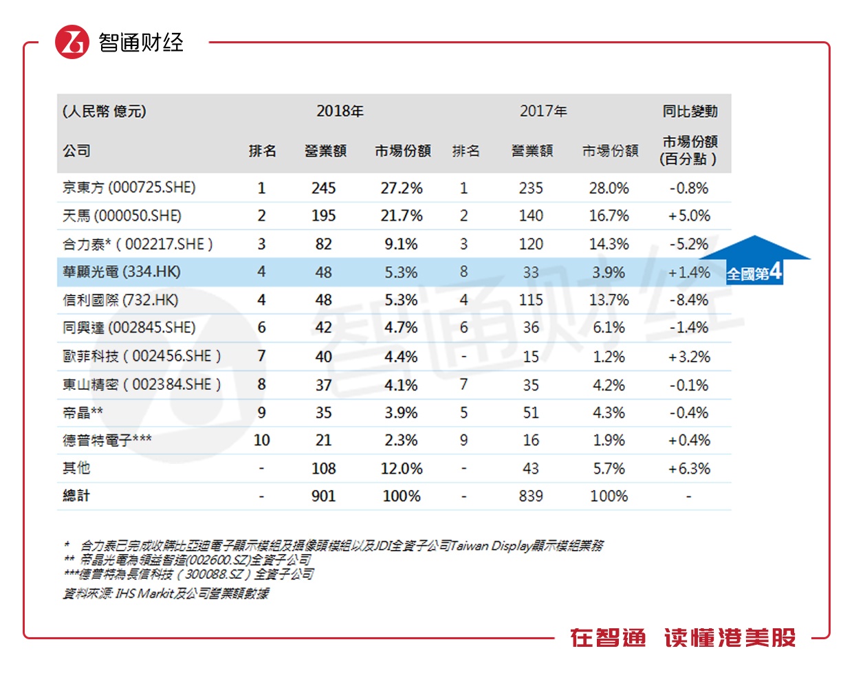 华显光电是TCL集团的子公司,公司2015年于香港上市,主要从事开发、生产、制造和销售LCD模组,以手机和中小尺寸为主。从2018年下半年开始,公司客户群发生了较大变化,目前主要有三星、华为、vivo、OPPO和小米,可以说全球行业前六名中的五家已经成为了我们的客户。