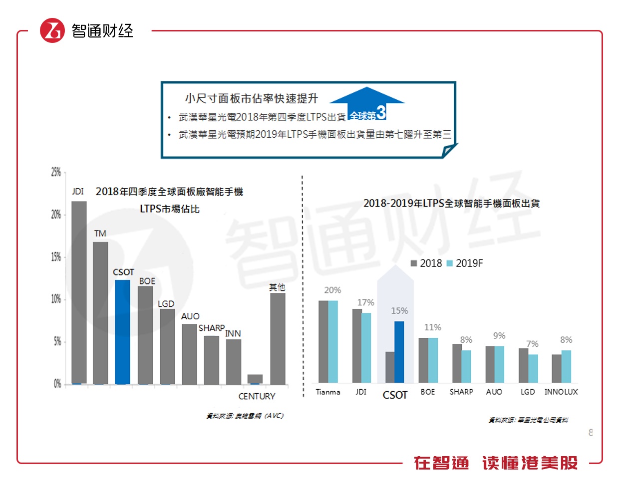 华星光电方面,根据第三方数据统计,2018年第四季度武汉华星光电 LTPS出货2,480万片,全球排名第三。2019年,华星光电预计LTPS智能手机面板出货将从第七名跃升至第三名。