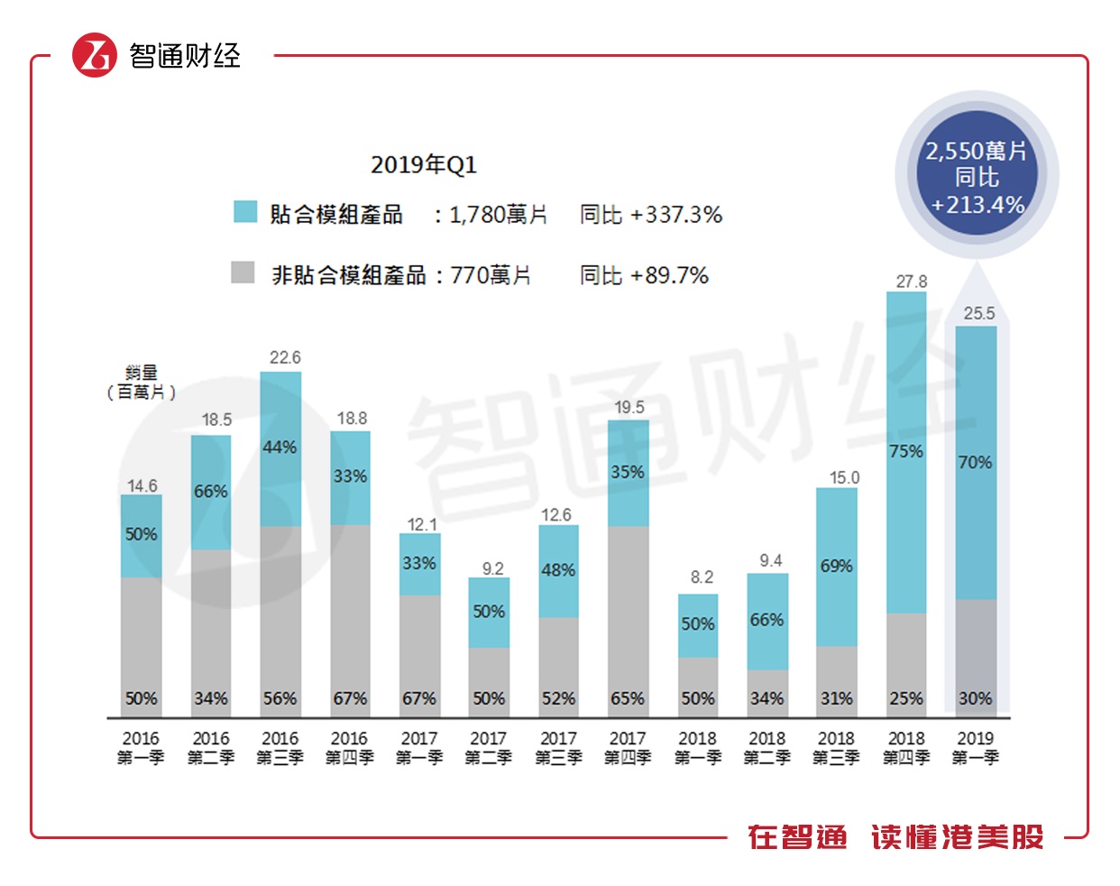 从2018年9月,公司开始为三星生产显示模组,加上传统旺季,下半年增长十分明显。今年一季度,华显的总销量同比增加了213.4%,其中,贴合模组增加至1780万片,同比增幅为337.3%;非贴合模组则增加了89.7%至770万片。另外,这两类产品的营业额分别为16.4亿元及3.6亿元,分别同比增加了336.5%及77.1%。