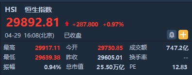 截至收盘,恒生指数涨287.8点或0.97%,报29892.81点,全日成交额达747.2亿。国企指数涨1.11%,报11638.18点,红筹指数涨0.83%,报4620.34点。