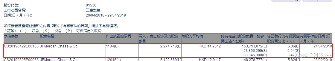 智通财经APP获悉,根据联交所资料显示,摩根大通于4月24日增持三生制药(01530)297万股,每股作价14.93港元,总值4434.21万港元,最新持股数目约1.53亿股,最新持股比例为6.06%。